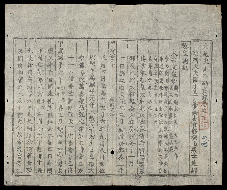 The “Nội các quan bản” edition, the most comprehensive and popular version of Đại Việt sử ký toàn thư, was printed in 1697 during the Chính Hòa era by efforts of the historian Lê Hi. sources 7, 11 and 12